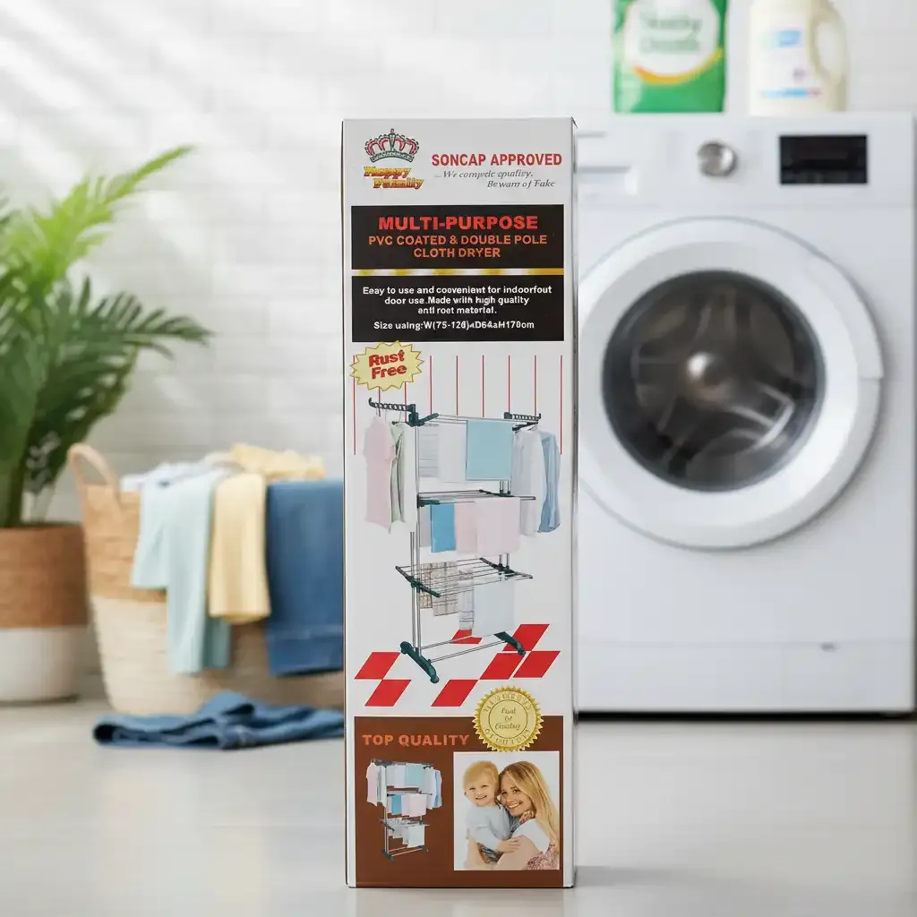 Introducing the Happy Family Multipurpose PVC Coated Double Pole Cloth Dryer, your ultimate solution for efficient and convenient clothes drying. Engineered for the modern home, this dryer combines robust construction with smart design to simplify your laundry routine. Say goodbye to cluttered spaces and damp clothes, and welcome a seamless drying experience that prioritizes durability and functionality.